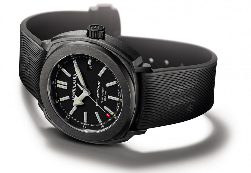 A starry night in the immensity of the desert, a moonless evening on the world's highways, the thrill of the unknown and the unexplored, the Terrascope –JEANRICHARD’s flagship model – shares the most beautiful night-time hours for everyday explorers who wish to savour every moment of the day in a new edition finished with a sleek black DLC coating. The alternating "vertical satin" finish on the flat surfaces and sandblasted finish on the bevels subtly underline the watche's original design, with its robust construction in several parts and its combination of a cushion case with a round glass. The indexes and hands are clearly distinguishable on a matt black dial, with cut-outs that make them stand out and a white luminescent coating. The sporty touch is completed by a black rubber strap with a folding clasp. The mechanical movement with automatic winding ensures accuracy and reliability twenty-four hours a day.