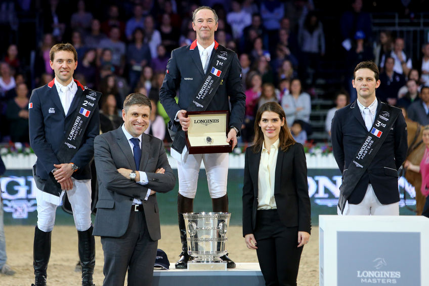 Prize-giving ceremony of the Longines Grand Prix at the 2015 Longines Masters of Paris. Juan-Carlos Capelli Vice President of Longines and Head of International Marketing and Fernanda Ameeuw, Ambassadress of the Longines Masters. On the podium (from left to right): Simon Delestre (FR), second of the Longines Grand Prix, Patrice Delaveau (FR), winner of the Longines Grand Prix and Billy Twomey (IRL), third of the Longines Grand Prix.