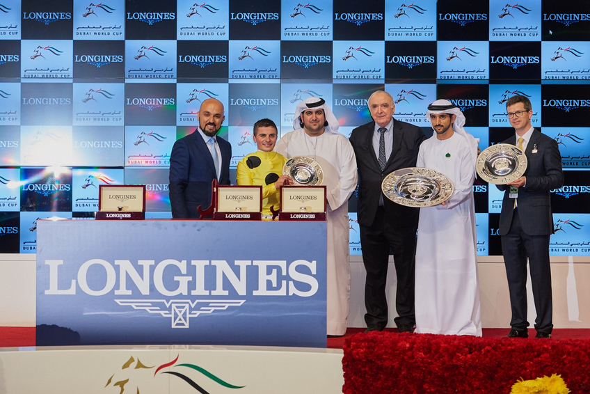 Being the Official Timekeeper of all events organized by the Meydan Group, Longines is proud to have been timing the races of the Dubai World Cup. The Swiss watch brand is also glad to be the partner of a highlight of the day, the Dubai Sheema Classic presented by Longines. Andrea Atzeni, riding Postponed, won this Group 1 race open to thoroughbreds. The owner, trainer and jockey of the winning horse were each rewarded with a Longines watch by Walter von Känel, President of Longines.