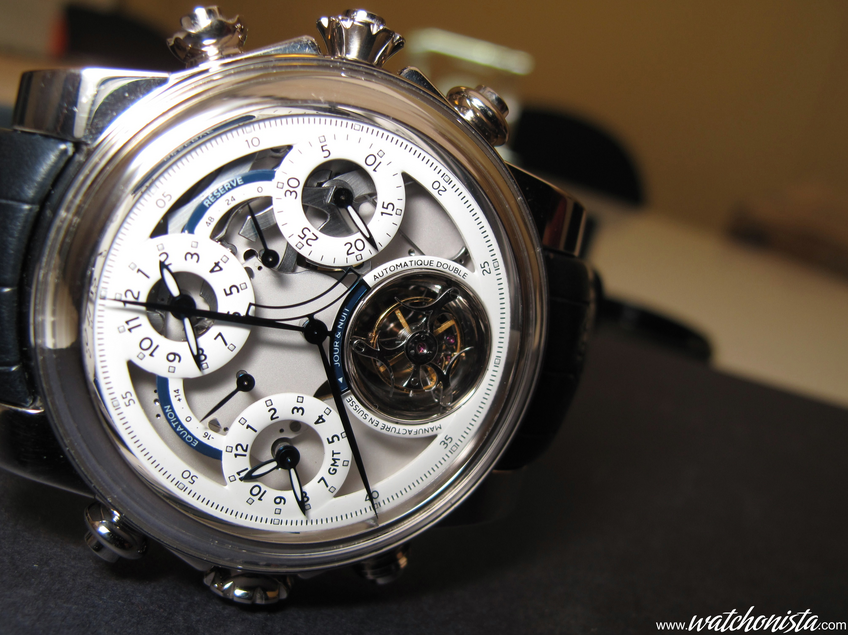 This face features the conventional time at 12 o’clock, an extra time zone with independent minute hand(!!) at 9 o’clock, the tourbillon 1 minute set at 21600v/h at 6 o’clock (the base 6 frequency as a time paradigm);