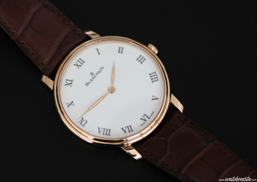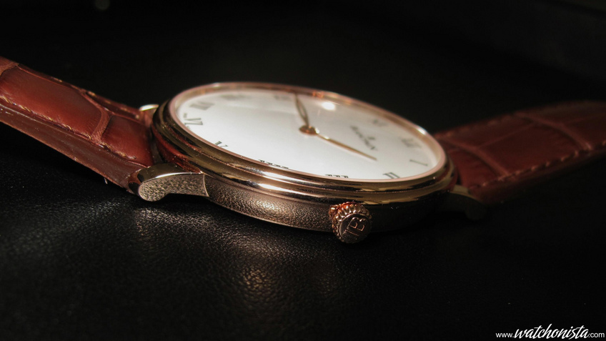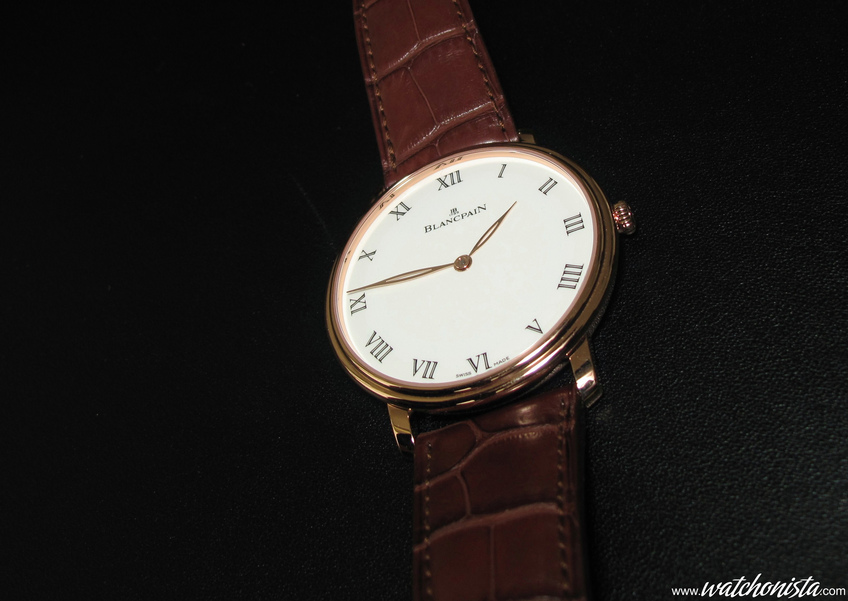 The domed «grand feu» enameled dial is another reminder of the vintage pocket watches. Because of poor lighting at Blancpain offices, the domed shape is difficult to see on the photos.