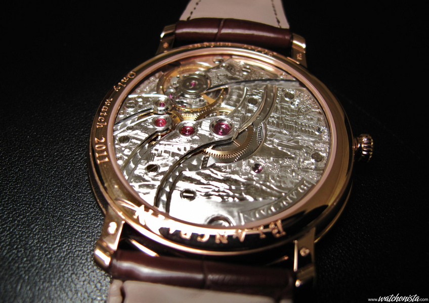 Akin to the De Bethune (whose «DB25 Ciel Etoile» is dedicated to the conquest of «The Rock» by the Grimaldis), the Villeret Extra-Plate features the Prince’s Palace. Besides the Monegasque theme, the decoration is unique, as it was manually engraved by Marie-Laure Tarbouriech, «Meilleure ouvriere de France» (best craftsman of France). The final result is best seen in full light, as it is in its movement where the subtlety of its details are revealed; The brass wheels bring colors to the piece, thanks to the relatively open bridges (compared to the 15B movement presented at Only Watch 2007).