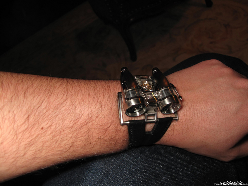 When I say « standard » when speaking of the HM4, it is of course all relative. The movement works at 21600v/h with a power reserve of 72h, provided by 2 barrels set with 50 rubies, and 311 components overall; They are installed in a 54X52mm case, and a thickness of 24mm. It is made of grade 5 Titanium and features five sapphire apertures, amongst which two are circular. To better form an opinion, here is a wristshot, the dimensions tell little about the size. A HM4 without the panda: