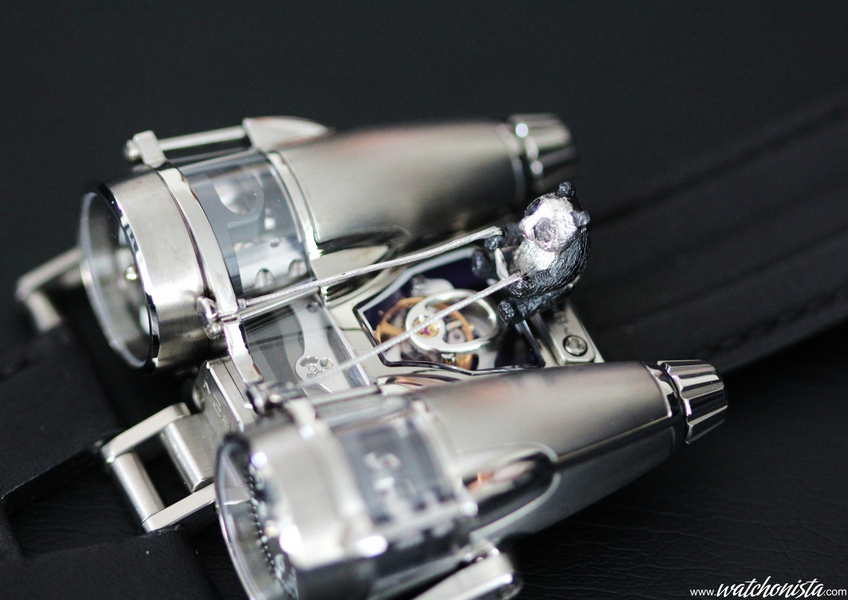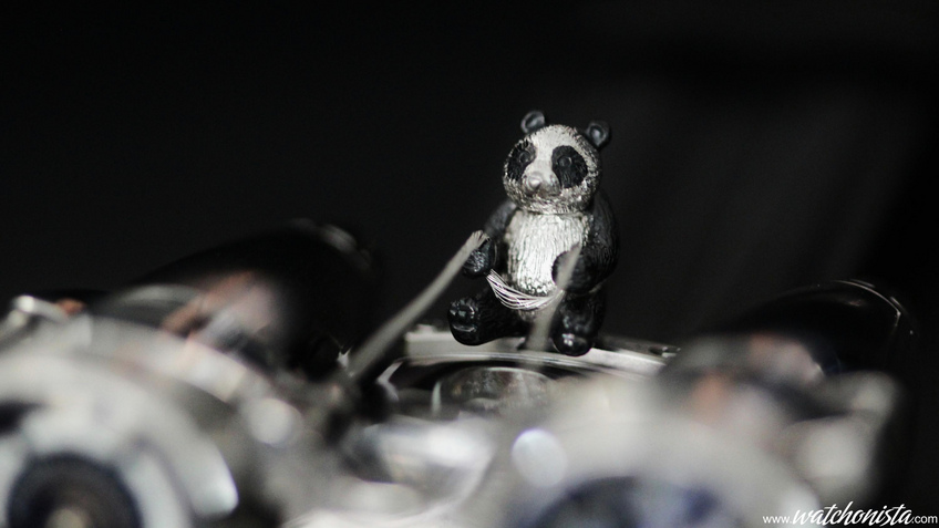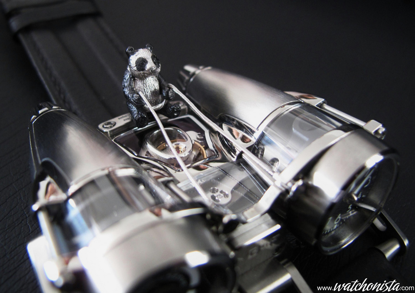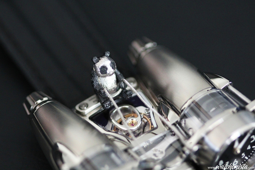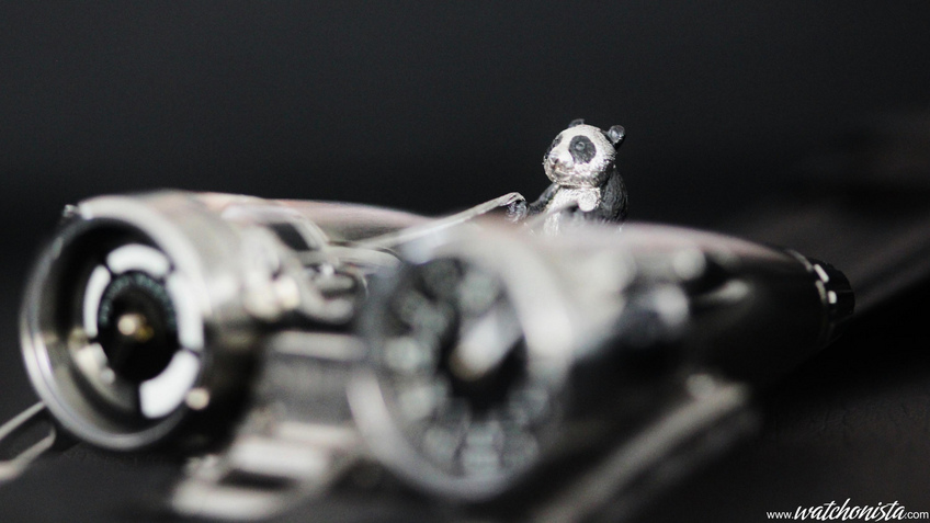 The double « gurney » of the HM4 was modified in order to make room for the panda and the reins, and the back of the watch is signed by Huang.