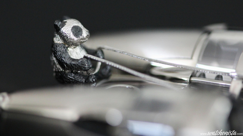 The panda is made of white gold PVD coated. It rides a HM4, whose removable reins are made of the same material.