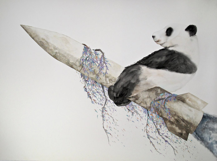 In his painting « The Mission of Peace », Huang Hankang represents the soaring of economic, sociologic, military and geopolitics of China with the metaphor of a Panda sitting on a rocket, with the ambiguity it carries. An interresting paraboly of the elite that rides a blind economical beast runing at full speed.