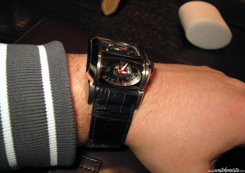 The watchcase is 40mm across, but the exclusive and dynamic lugs, together with the Hermes wide alligator sports wristband make it look like a 42mm.