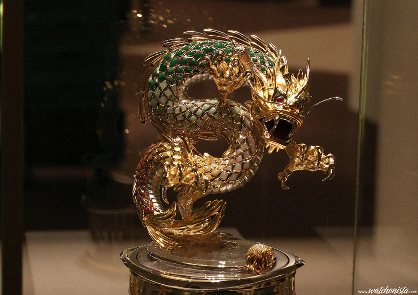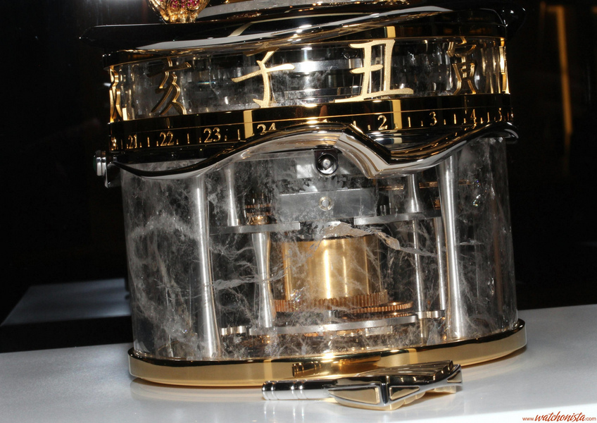 Of course, the dragon stays with all the traditional Chinese mythology codes, as it is also the case for the characters, displayed on the base made of rock crystal. Following the tradition, each of these characters represent 2 hours in base six. The pearl of knowledge jumps 6 times per hour, while the dragon does the same once over the same period; Of course, it takes enormous amounts of power to move this mass of precious materials.