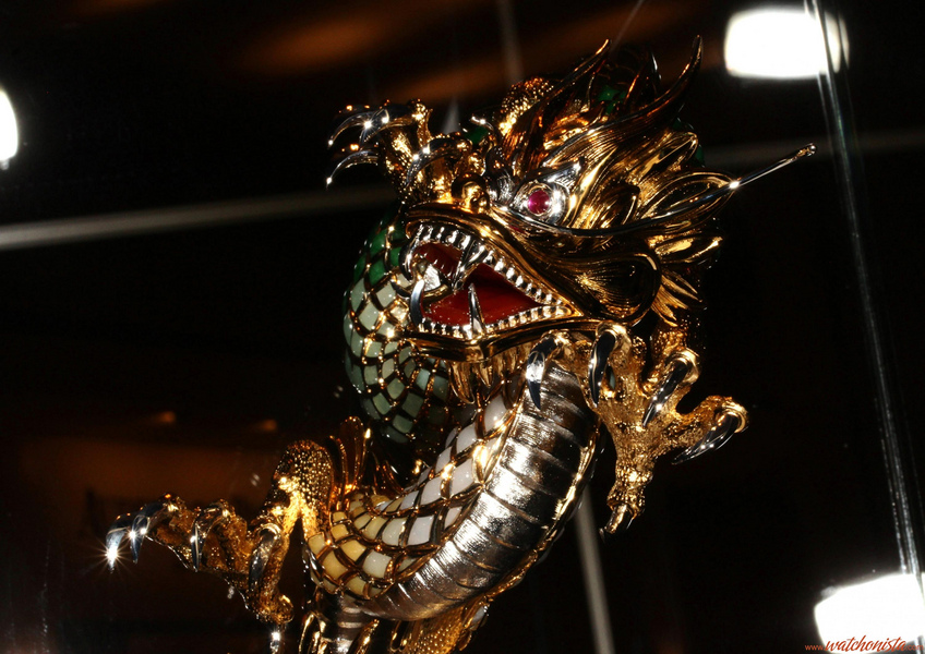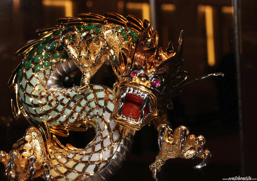 The dragon's body is made of gold and silver.  The scales are made of jade, 585 pieces fitted depending on their color in order to produce a shaded effect. The eyes are made of ruby, the tongue is carved in cornelian and the claws are made of white gold. The pearl of knowledge is set with diamonds, sapphires and rubies.