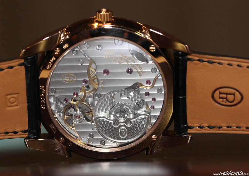 Of course, in watchmaking, technique is nothing if not served by a flawless design. The watch is an absolute aesthetic achievement; a single criticism though, the aperture that shows the movement on the back of the case is vaguely potato-shaped, when one could have expected it to be fully oval … To achieve an oval watch is always a challenge, because supermarket watches sometimes sullied this shape, a little kitsch…   In this case, the watch is beautiful, as it takes after the Bauhaus, the Art Deco (a fundamental influence at PF). The lugs designed by the brand from Fleurier never fit better than on shaped cases, akin to the Bugatti Super Sport (the watch); they perfectly suit the offbeat case design.
