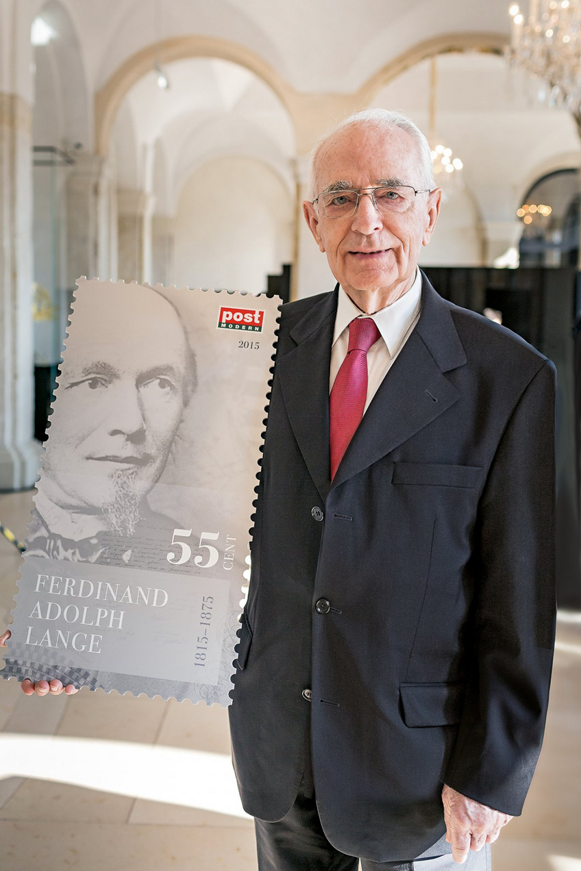 Walter Lange with the stamp in hommage of Ferdinand Adolph Lange