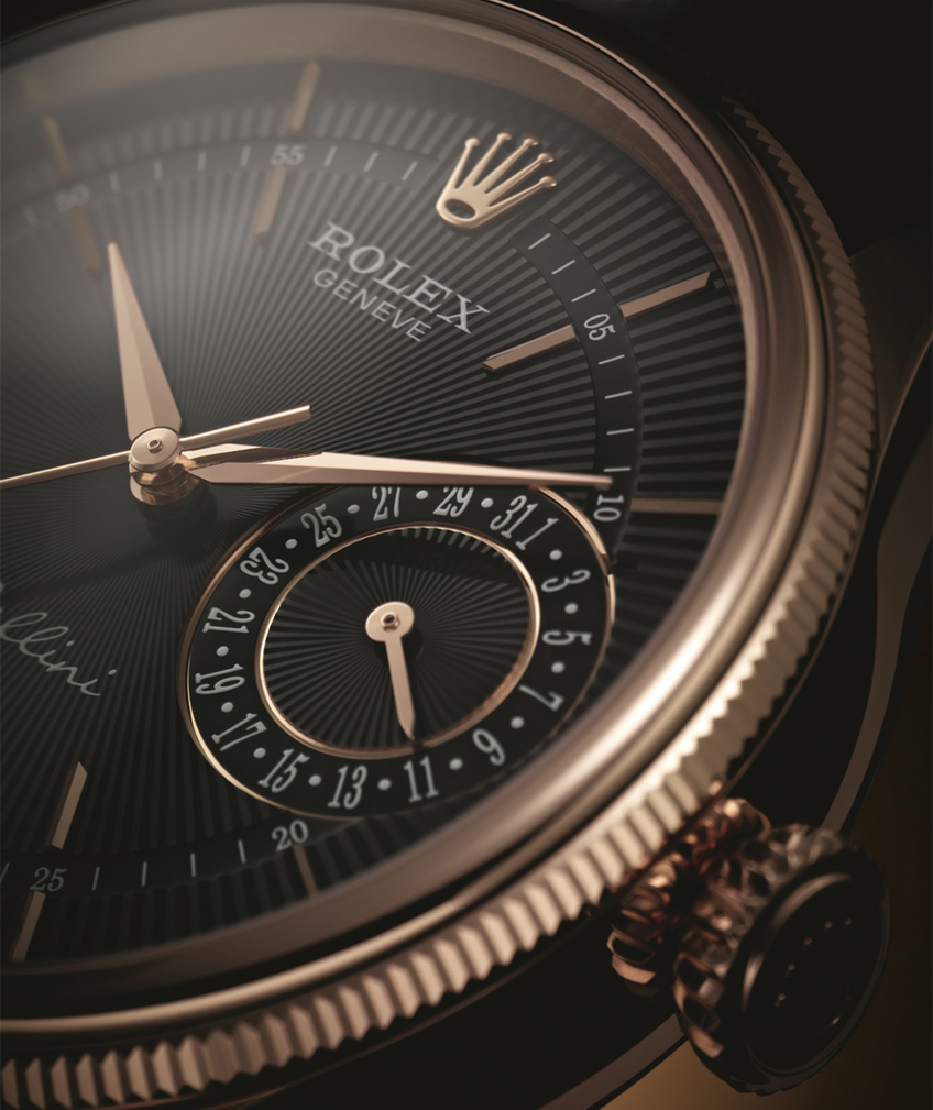 Their round shape and classic 39 mm diameter are marks of tradition, while the refined lugs, the polished finish and the double bezel – one domed and the second delicately fluted – add a touch of distinction. An emblematic Rolex feature, this fluting is also present on the case back, serving to screw it down. The case back is domed as in bygone eras. The flared shape of the screw-down crown highlights the refined aesthetics of the Cellini. The dials also bear witness to knowhow and tradition. They are either lacquered or embellished with a black or a silver-plated classic “rayon f lammé de la gloire” guilloche motif and adorned with gold applique hour markers. The layout of the dials is determined by the watches’ different functions, dividing the collection into three families. The Cellini Time models are the quintessential expression of a watchmaking classic, the guardian of hours, minutes and seconds. The Cellini Date models add a date function via a hand on a small sub-dial, blending practicality and elegance. Finally, the Cellini Dual Time models indicate the time in two time zones simultaneously and feature an elegant sun and moon day/night indicator in an aperture on the sub-dial for the second time zone.