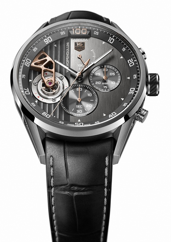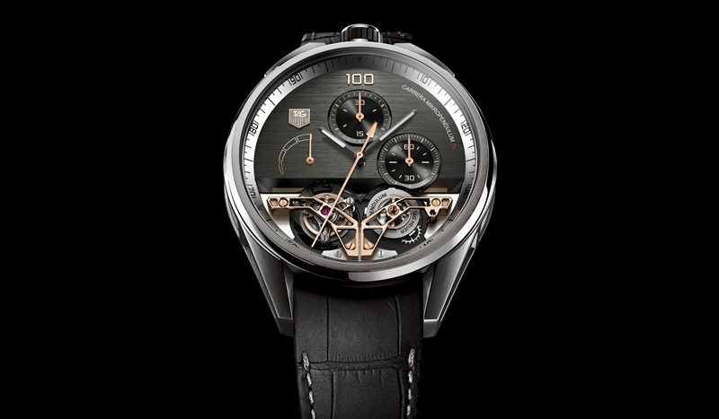 The MikropendulumS, presented at BaselWorld as a concept piece, consists of a double tourbillon inspired by the MikrotourbillonS, which TAG Heuer unveiled in 2012. Each tourbillon has its own pendulum: the watch beats at a frequency of 12 Hz and the chronograph at 50 Hz.