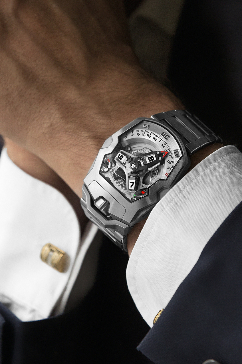 Many already know the UR-210 for its orbital complication and imposing retrograde minute hand. However, this 'S' version – a limited edition of just 35 pieces – adds an even stronger monochrome aesthetic with its full metal bracelet, which was developed specifically for URWERK. The radical UR-210S is uncompromising – it will be love at first sight for aficionados of avant-garde horology.